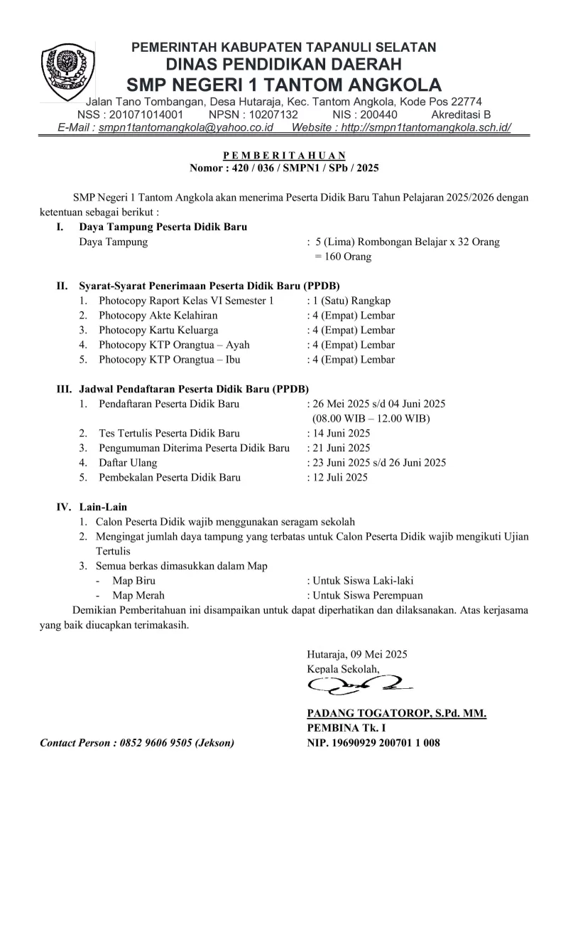 SMP Negeri 1 Tantom Angkola akan menerima Peserta Didik Baru Tahun Pelajaran 2025/2026 dengan ketentuan sebagai berikut :